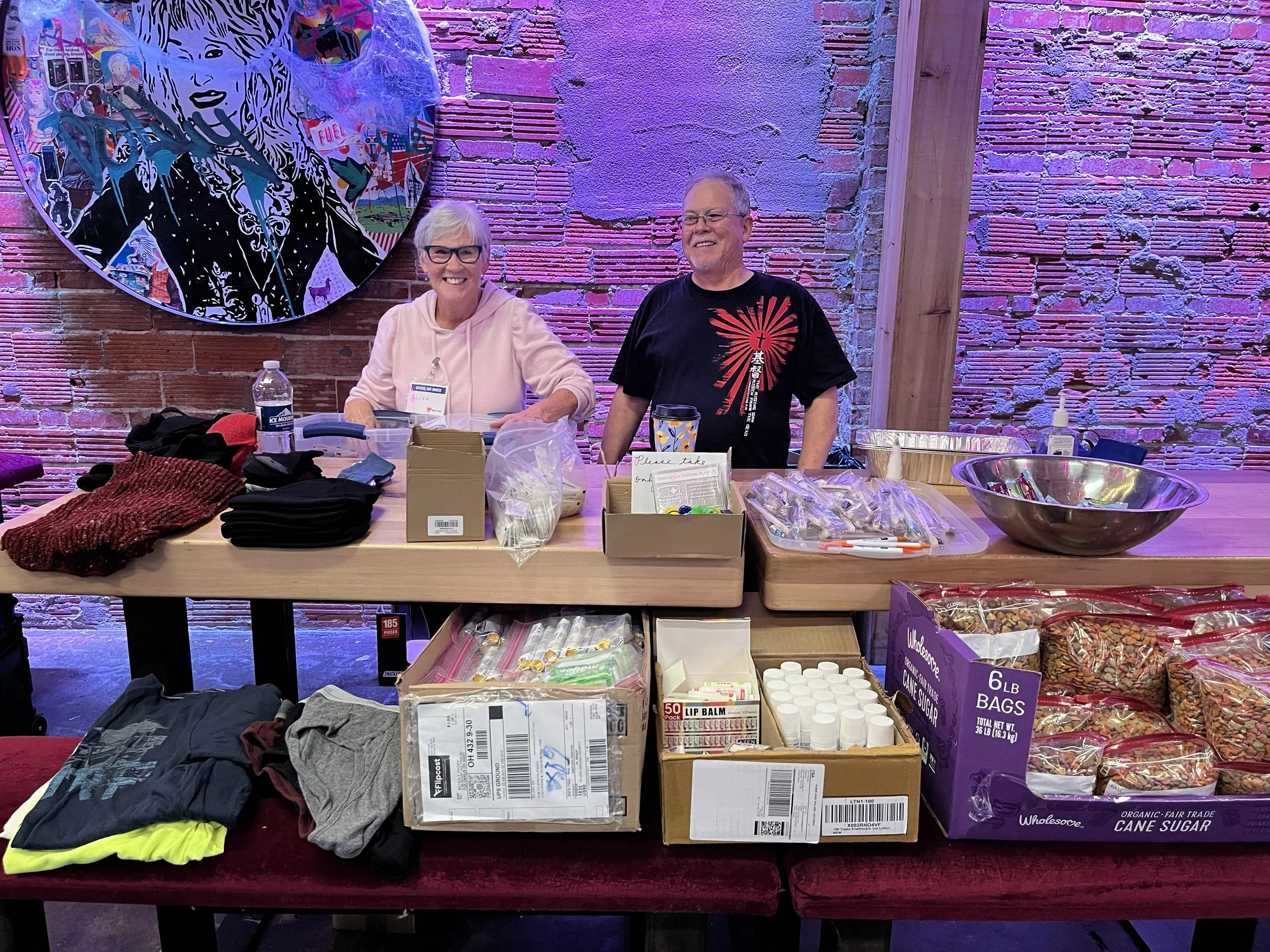 Razors. Wipes. Specific socks. One man explained he lived along the railroad tracks and used wipes to bathe. After that, wipes became a staple. Guests asked for darker socks because they do not show dirt as quickly. Laundry pods were added after seeing another outreach partner distribute them. Eventually, Mike and Lisa began assembling full laundry kits.